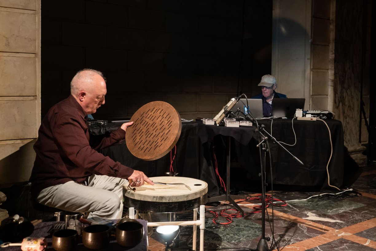 In Open Space with Fast, percussionist and composer Fast Forward activates a constellation of unconventional objects and resonant materials, improvising within a dynamic electronic environment shaped by Behrman’s sound materials. This performance reflects their decades-long dialogue around technology, listening, and shared experimentation.