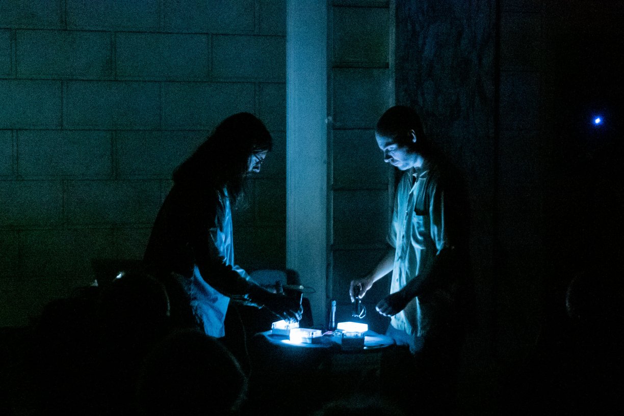 The current version made in 2016, uses 21st century technology for the spatial distribution. Three people can play it, one on laptop, two on flashlights. In tonight’s performance, the laptop is handled by Frankie Mann and the flashlight performers are Daniel Fishkin and Cleek Schrey.